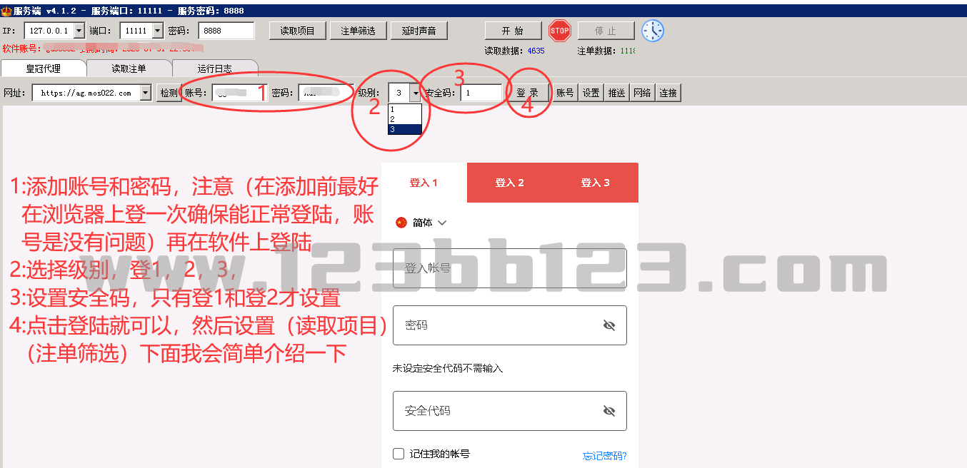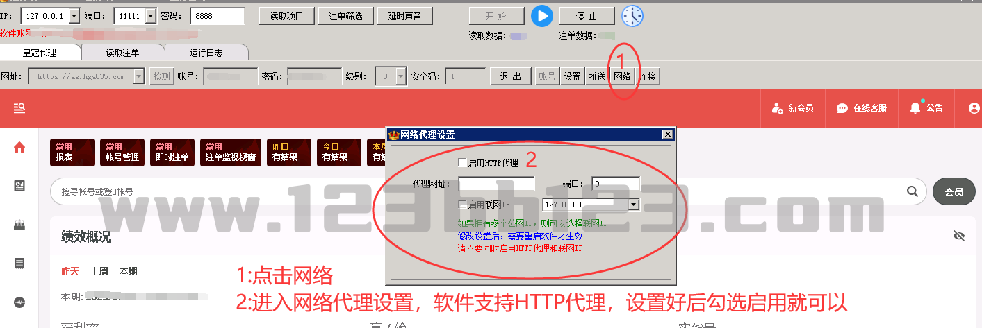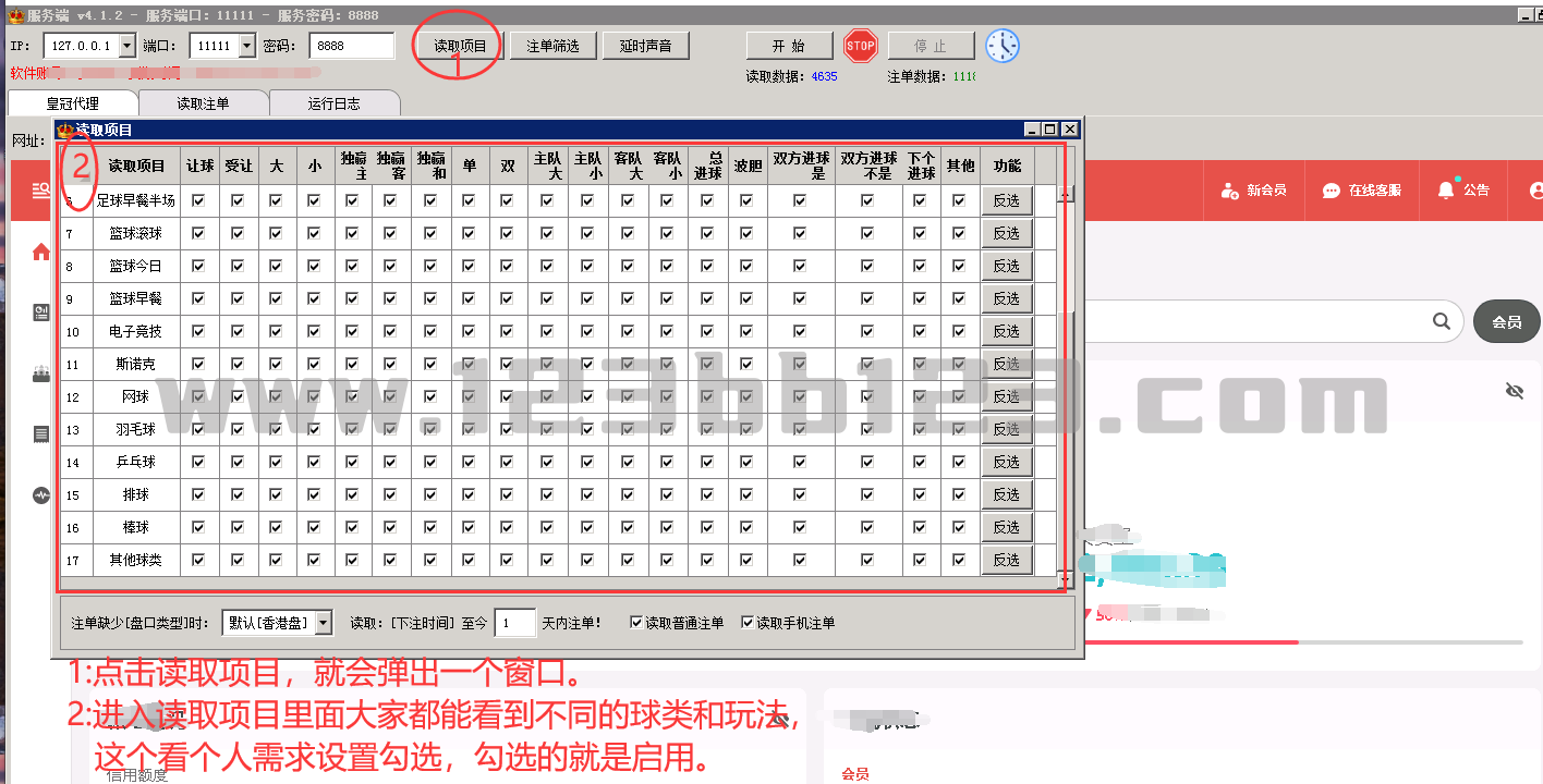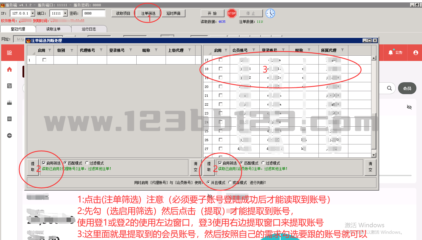 左边窗口是设置代理账号,右边窗口是单独跟的会员账号,如果要全跟整个代理线的就不用打开这个注单筛选窗口设置了。注意:必须要服务端账号登陆成功后才能读取账号。