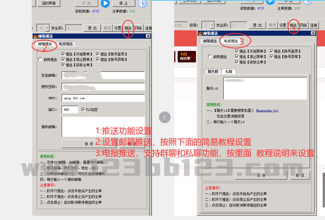 5:点击推送会出新窗口,里面是可以设置邮箱,Telegram单人,Telegram群推送功能,按照里面的简易教程操作就可以。设置好后必须要勾选启用才能生效。