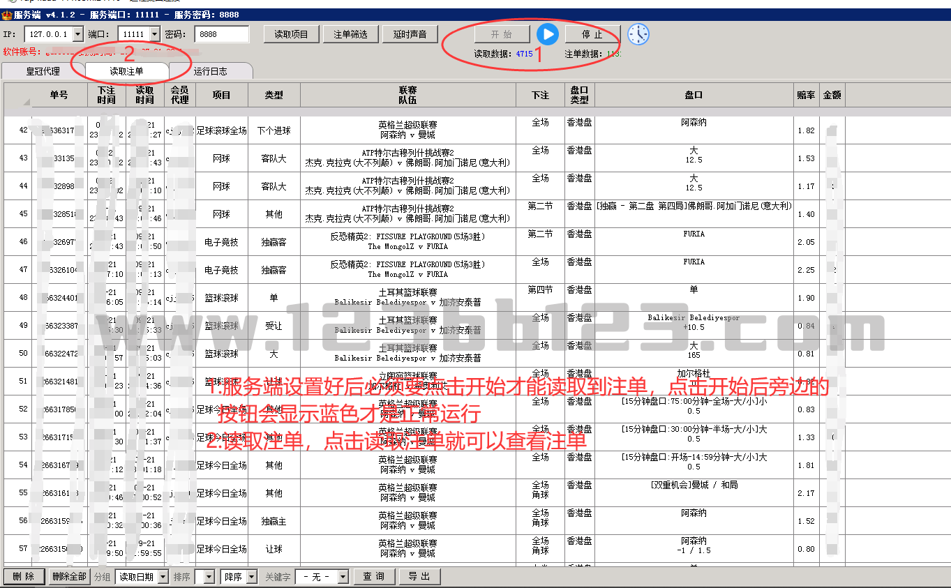 7:上面的几个操作步骤完成后可以点击开始进行跟单,想要查看读取回来的注单可以点击读取注单然后就会弹出新窗口来查看注单的。